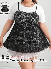 SHEIN MOD レース パッチワーク ウエストシェイプ フーディースウェットシャツ ワンピース (プラスサイズ) SKU: sz25052614966521752 ![]()