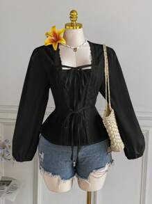 こちらも画像では見にくいですが、胸とウエストにヒモがあって絞ってウエストが作れる感じのブラウス。